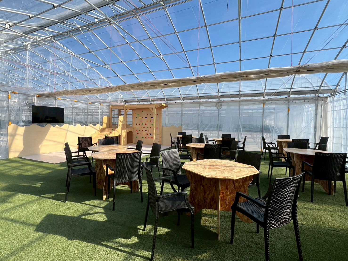 いちご狩りスペースは5ブースあります。また、フリースペースにはキッズスペースもあります。